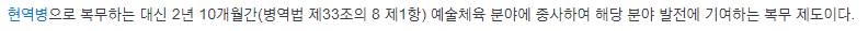정확히 말하자면 군면제라기보다는 예술체육 분야에 종사하여 병역 의무를 다하게 하는 제도입니다.