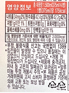 칼로리는 준수하지만 당류는 43.7g으로서 역시 무시할 수 없는 엄청난 당류 양입니다.