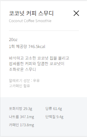 무려 61.4g의 당류를 자랑합니다. 더 놀라운 건 칼로리네요. 746kcal.. 먹어볼 엄두도 안 납니다.