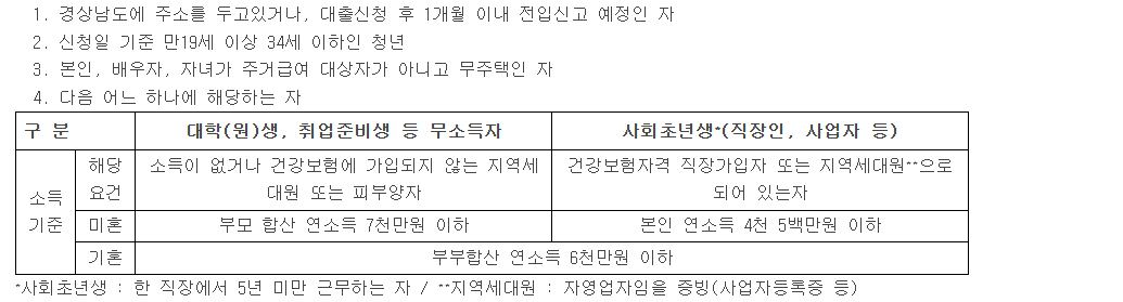 경상남도에 소재한 임차보증금 1억 원 이하, 전용면적 60㎡ 이하인 주택, 아파트, 오피스텔 등 주거용 건물에 임대차계약 체결 예정자 및 계약체결 3개월 이내인 신청일 기준 만 19~34세 무주택 청년